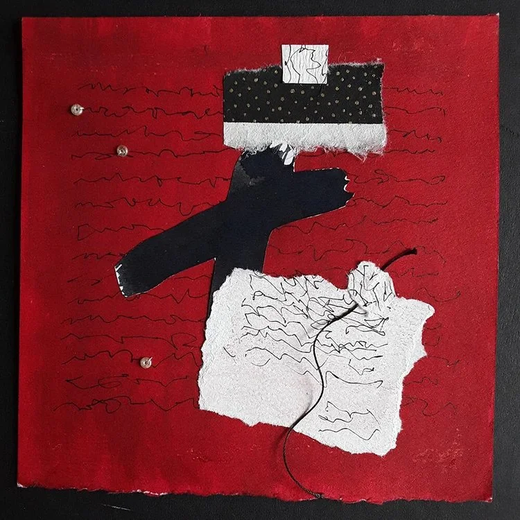 “I am attaching my latest. I often wish we were exchanging in person (though not through the mail) because my originals always look better than the photos. . . . Here's my new one, done with inks and silk and metal threads. Hope it inspires a wonderful text from you!” Linda to Rose email, Oct. 21, 2020