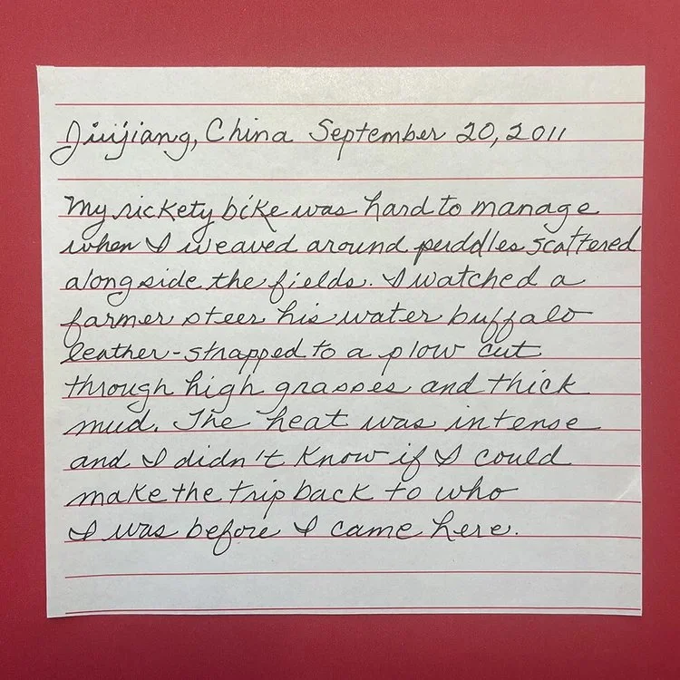 “I love that it is handwritten, invoking the sense of a letter. And that big X shape reminds me of your oxen. Also love that last line. Your time in China (and elsewhere too) has changed you, and that is something that much of your work addresses, even if sometimes obliquely. Very well done!” Linda to Rose text, Feb. 6, 2021