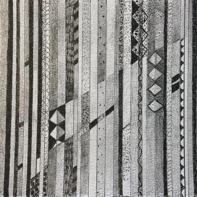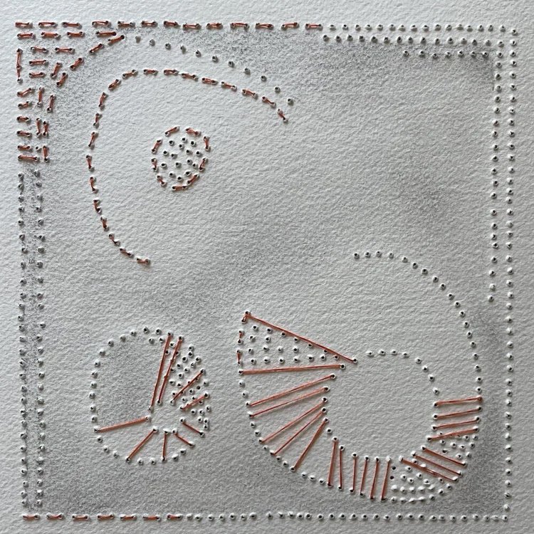 “I love it! So exciting to have a spot to play. And your piece is wonderful. I see the [William] Tillyer influence. Are the black dots throughout dots or stitches? It does capture in-between spaces. . . . There is an Asian influence to the piece visually. I think we have made a very good start to our conversational wanderings.” Linda to Rose text, Sep. 9, 2020