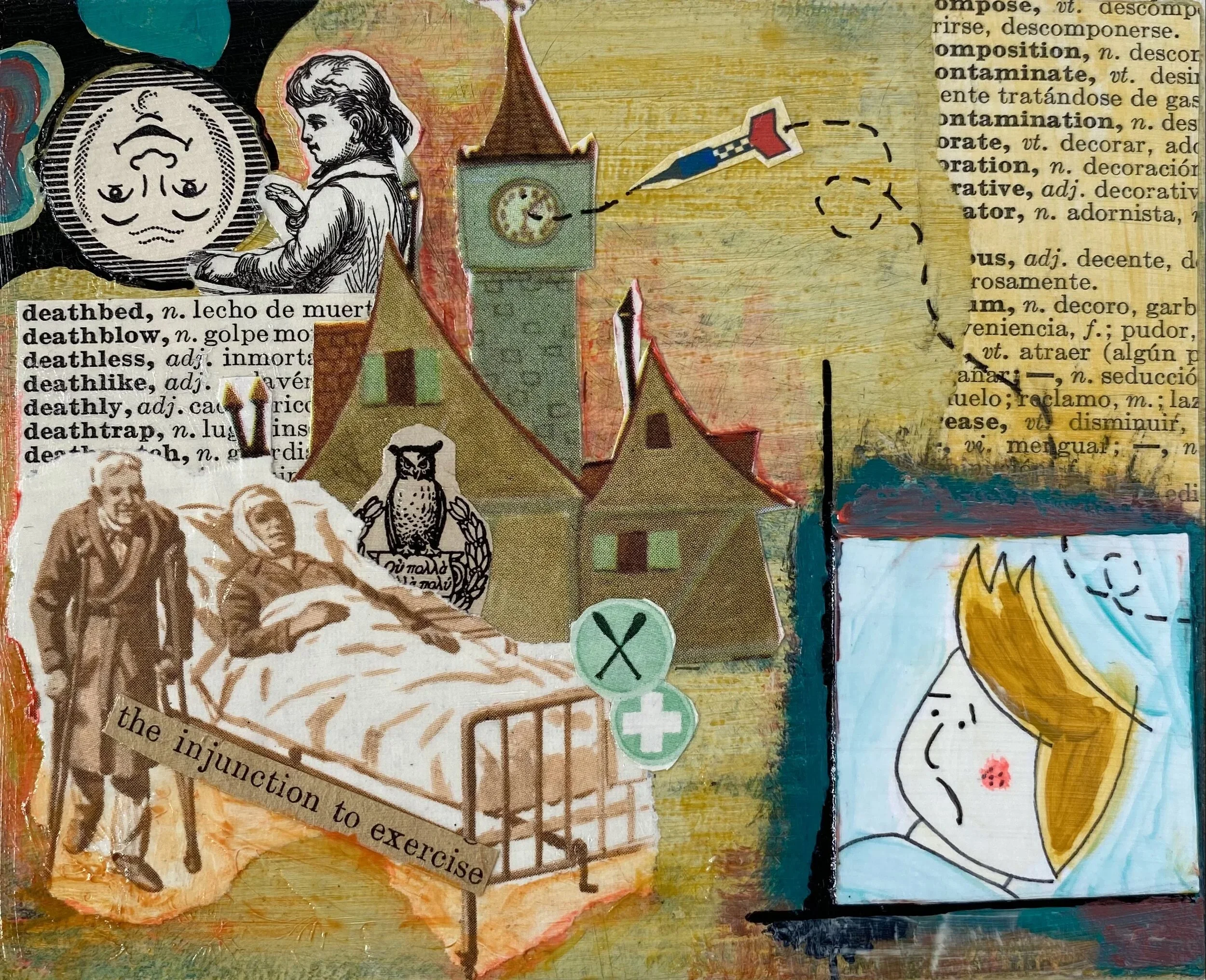 And then he sees it. Suspended in the sky at his eye level ahead is a room. Hanging there. In the sky. It’s as though he’s looking into a square dollhouse room cut into the sky. In it he sees a hospital room, a man on his deathbed, so thin he’s made of matchsticks. Another gentlemen, older and on crutches, a bandage around his head and jaw, stands beside the bed. He offers the dying man water with an eye dropper. The dying man stretches his neck up and gapes his mouth like a baby bird, reaching for the drips. Archer hears the man on crutches as if he’s speaking inside Archer’s ear.