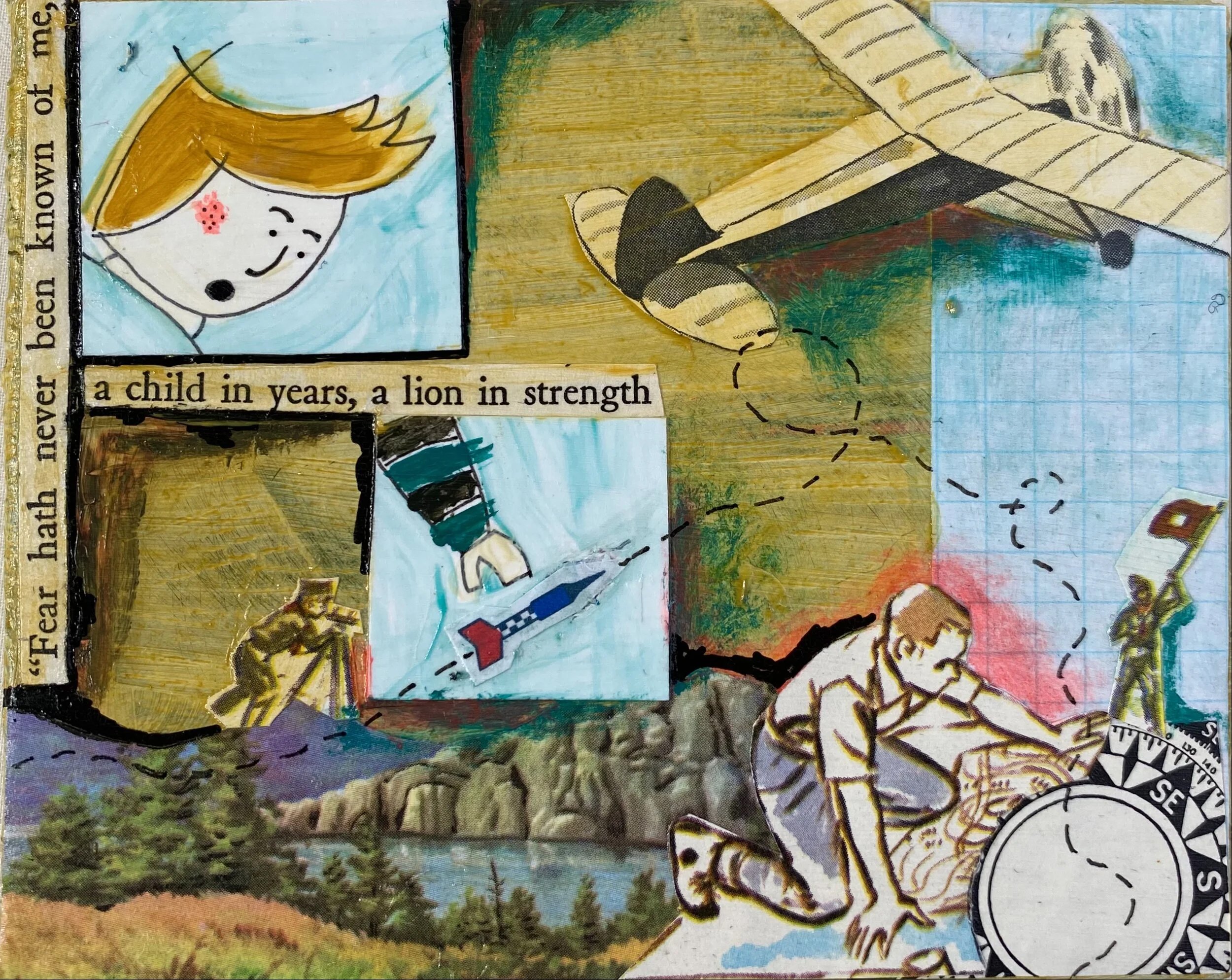 Now Archer can only walk backwards and the banners light up the dark. How will I escape? He walks and walks. His feet are on his legs backwards and he walks backwards and his hand ankles are where his feet wrists should be. No, that’s not right. And all around, a million mile high and million mile below film screen towers up and plunges down and on it are images. Images that change and fade and repeat: a man in an airplane, his face all smiles; a teenager with blonde hair receiving a kiss from a girl with pink hair, little buttons on her jacket, both of them grinning; a goldfinch sitting in a little tree in a tiny garden; a sunset over a lake and cliffs; and then a boy – it’s Archer! But poopa-doopa in his pants smaller kind of Archer, maybe – sitting in his mom’s lap as she reads aloud to him from a favorite book.