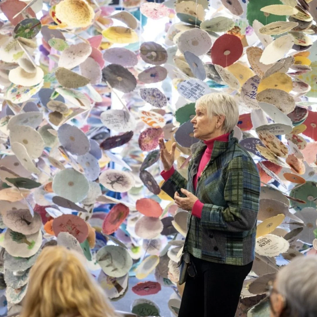 At every exhibition, the handmade paper rounds, bound with bookbinding thread (perhaps the world’s largest book?), hang in flowing columns reminiscent of tree trunks. They invite visitors to pause, to listen, to reflect. I’ve seen people moved to tears reading a stranger’s words and recognizing something of themselves within them. These moments reaffirm the deep connection we all share, not only with trees, but with each other.
