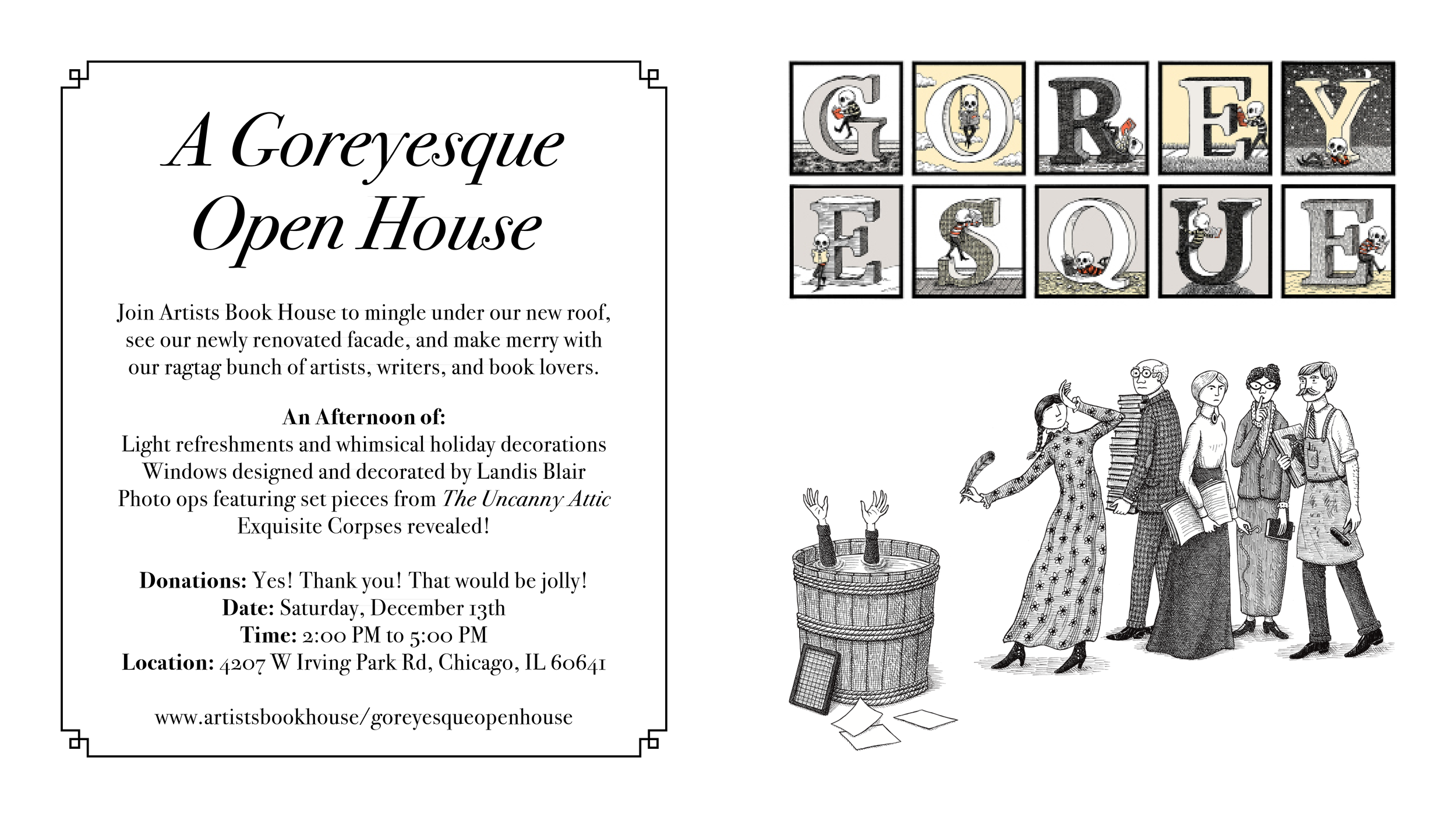 After the architects toiled over the blueprints, and much documentation was uploaded into the aether, a crack team of workmen completed construction just before winter set in. To celebrate our good fortune, the 100th birthday of Edward Gorey, and the upcoming holidays, we have decided to host an Open House at Artists Book House.
